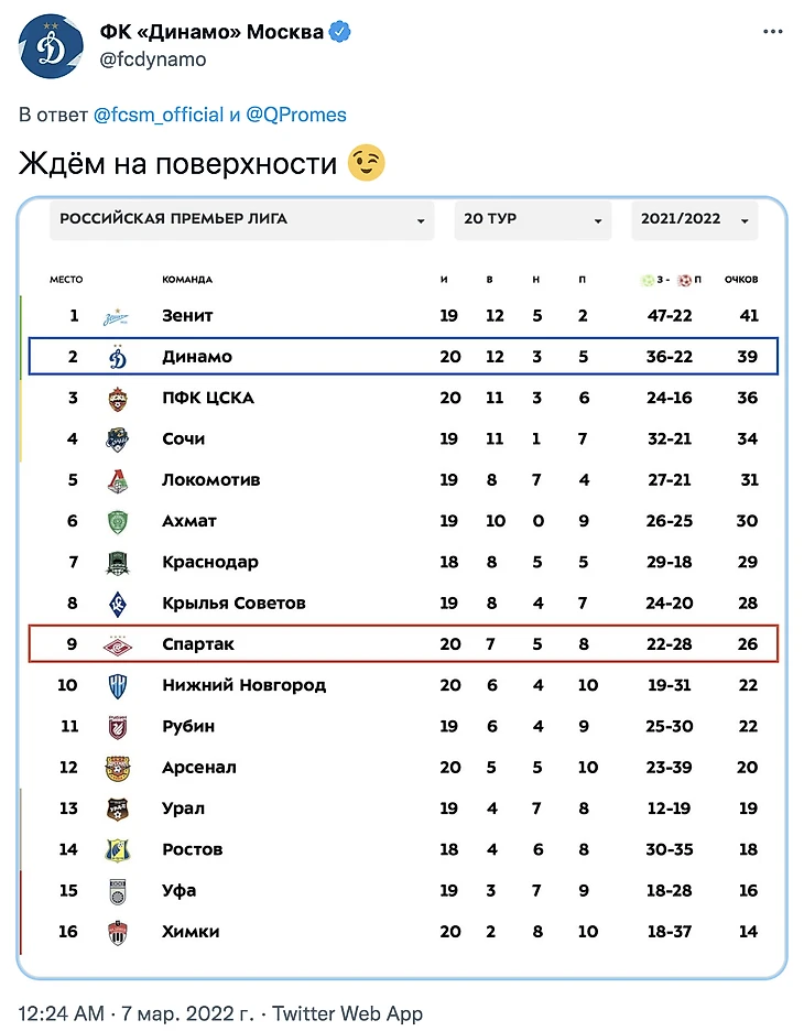 Пресс-служба «Динамо» в ответ выложила турнирную таблицу РПЛ и написала: «Ждем на поверхности».