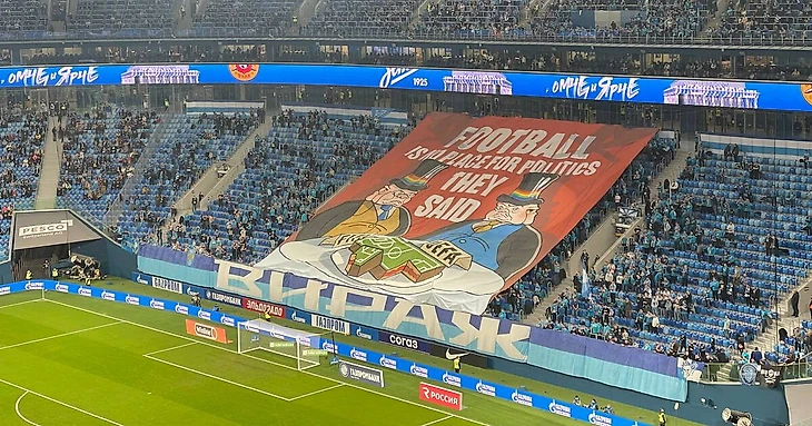 «В футболе политике нет места, говорили они». Фанаты «Зенита» вывесили баннер про чиновников ФИФА и УЕФА в цилиндрах с радужными полосами