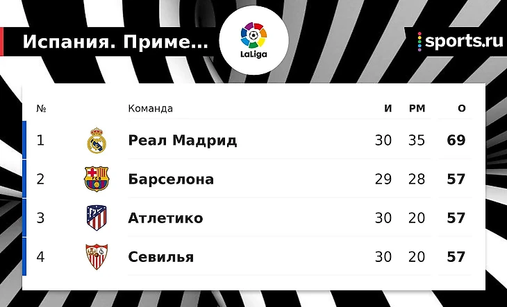 Лидирует в Примере «Реал», который в 30 матчах набрал 69 очков.