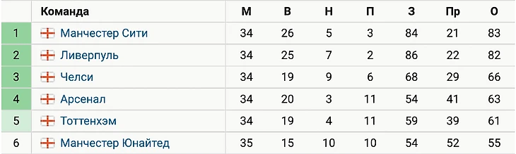 В 35-м туре АПЛ занимающий четвертое место «Арсенал» (63 очка) обыграл «Вест Хэм» (2:1) и опережает «МЮ» (55 очков), который идет шестым в таблице, на восемь баллов.