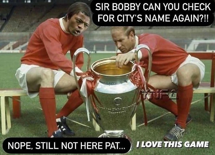 Бывший игрок «Манчестер Юнайтед» опубликовал мем, где они вместе с Бобби Чарльтоном пытаются найти название «Манчестер Сити» на кубке победителей Лиги чемпионов.