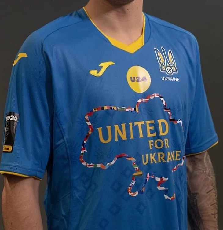 На новой форме Украины есть карта страны из флагов разных государств, Буча и другие города вписаны в номера, слоган «Объединяемся для Украины» и шеврон U24 про Евросоюз