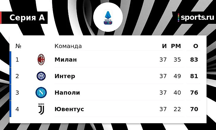 В расчет принимались выступления клубов в 35-м, 36-м и 37-м турах. На данном отрезке «Милан» выиграл все три матча с общим счетом 6:1.