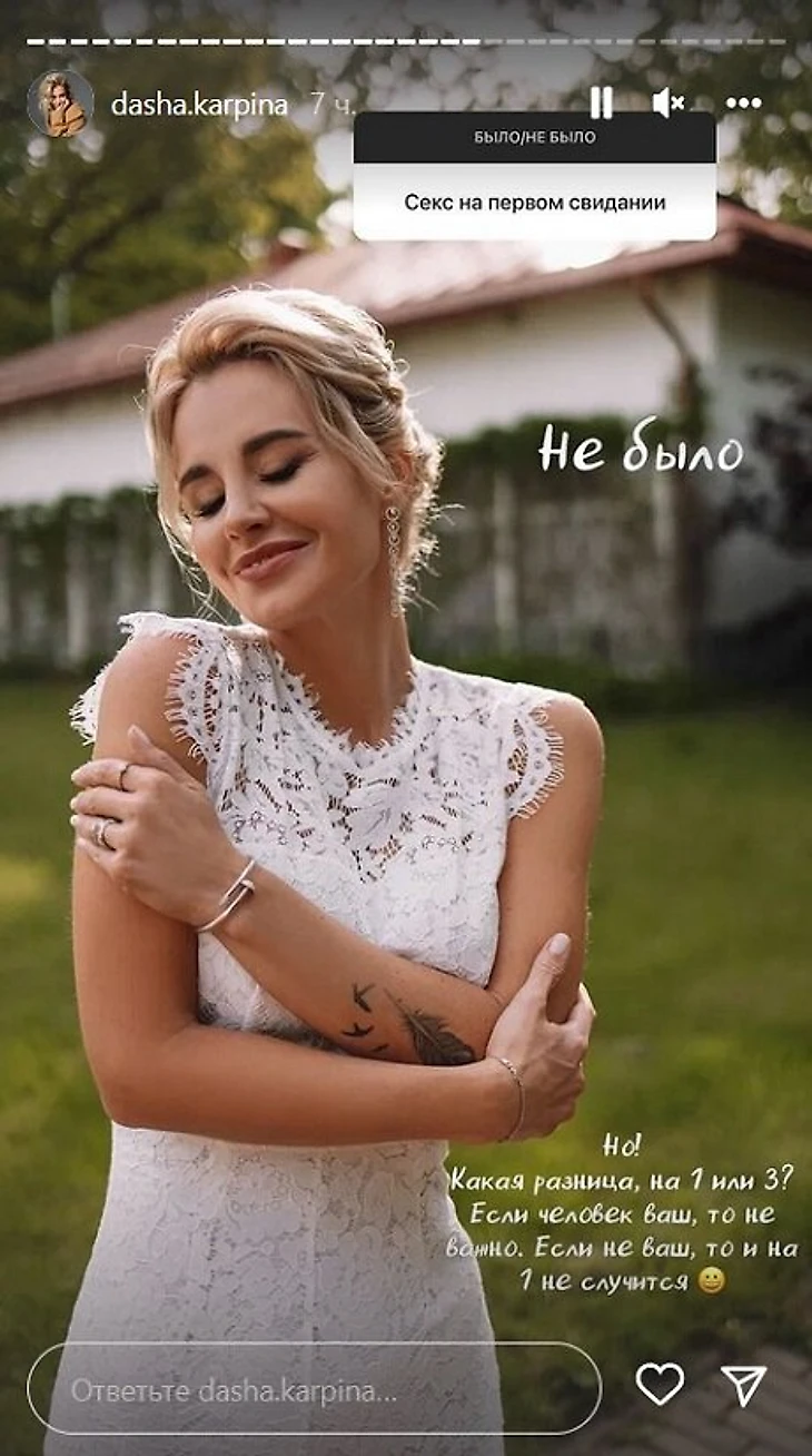 – Не было. Но какая разница – на первом или на третьем? Если человек ваш, то не важно. Если не ваш, то и на первом не случится, – написала Дарья Карпина, жена тренера «Ростова» и сборной России, отвечая на вопросы в сторис инстаграма.