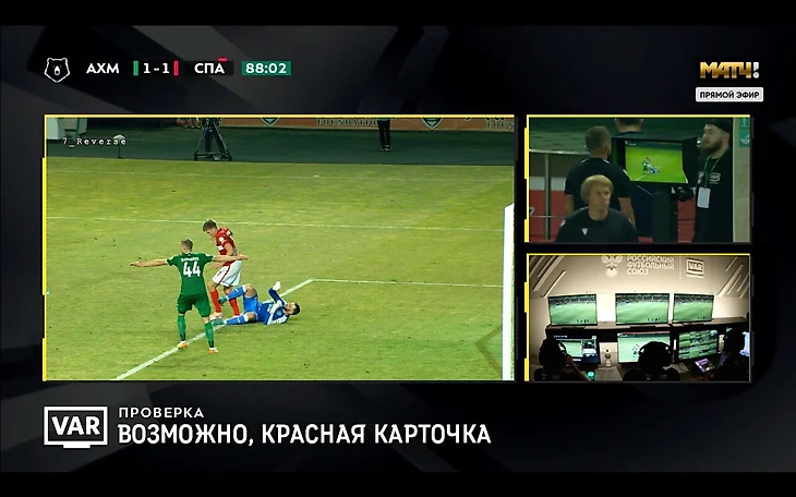 Арбитр Владислав Безбородов воспользовался ВАР и изучил момент на предмет возможного удаления голкипера. Но в итоге решил не показывать красную карточку.