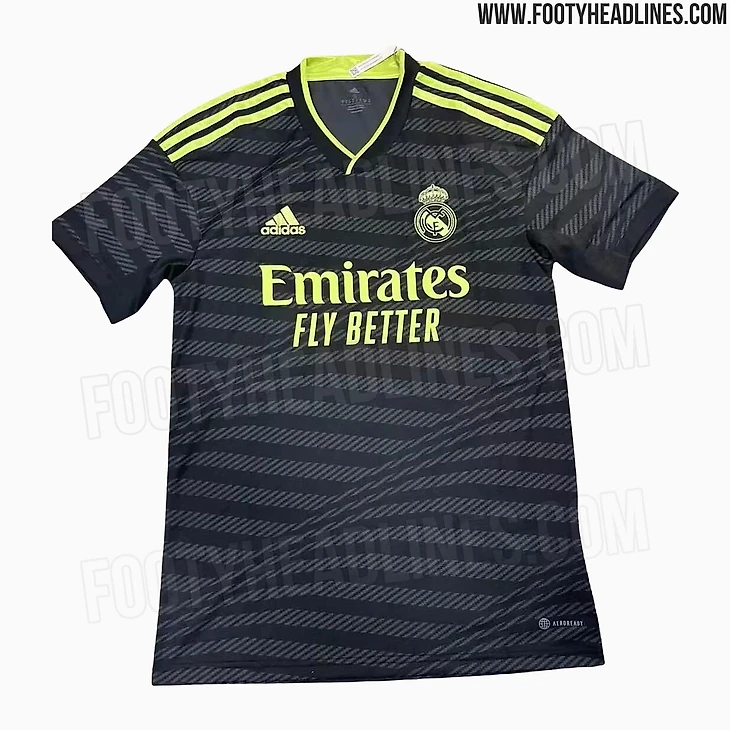 Футболка из третьего комплекта формы мадридского клуба будет черного цвета с лимонно-желтыми деталями и горизонтальными полосками.
