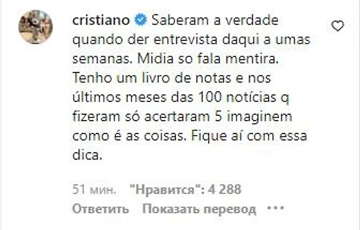 Из 100 новостей, которые они написали за последние несколько месяцев, только 5 были правдивыми. Представьте себе, как дела обстоят на самом деле», – написал Роналду.