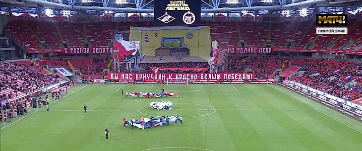 «В тесной квартире на телике деда – вы нас приучали к красно-белым победам», – написано на баннере, который вывесили болельщики московского клуба.