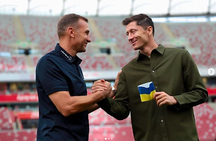 Левандовски выложил фотографию с Шевченко и написал: «Спасибо, Андрей. Было приятно встретиться! Носить капитанскую повязку в цветах флага Украины на чемпионате мира – честь для меня».