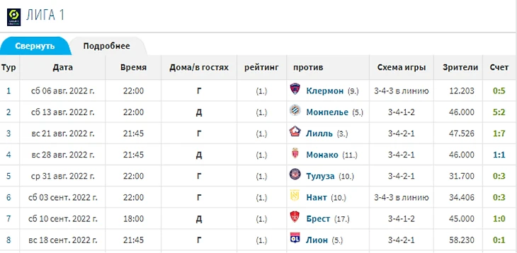 В последнем туре Лиги 1 ПСЖ одержал минимальную победу со счетом 1:0 в гостях с «Лионом». Матч стал четвертым подряд в турнире без пропущенных голов. Единственная потеря очков в чемпионате пришлась на домашний матч с «Монако». Команды сыграли 1:1. Результаты ПСЖ в чемпионате Франции 2022/2023.