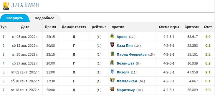 В чемпионате Португалии «Бенфика» показала стопроцентный результат в семи стартовых тура. «Орлы» выиграли 7 игр с разницей голов 19:3. По надежности обороны команда лидер чемпионата, по активности атаки лучше только «Брагаа» с 23 мячами. Результаты «Бенфики» в матчах Примейры сезона 2022/2023.