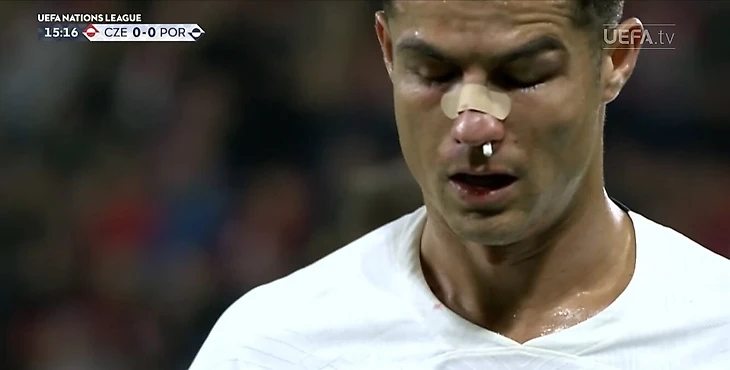 У Роналду пошла кровь из носа. Врачи сборной смогли ее остановить, они также наклеили пластырь на нос футболиста.