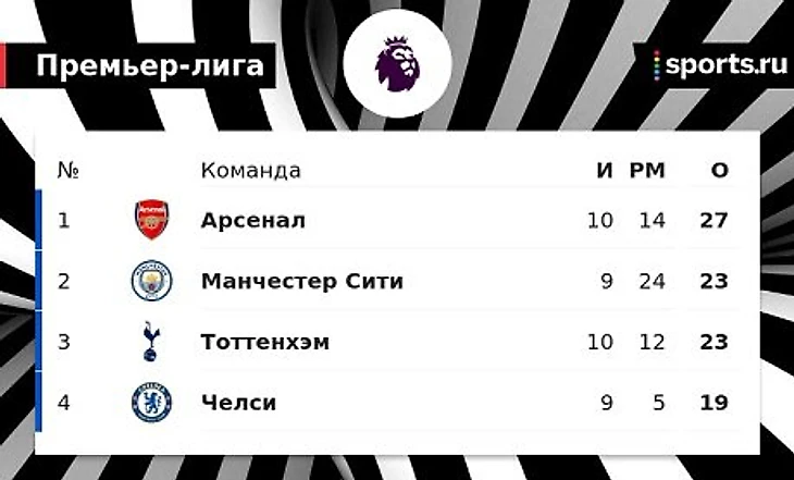 «Канониры» набрали 27 очков в 10 матчах чемпионата и сохранили первое место по итогам тура.