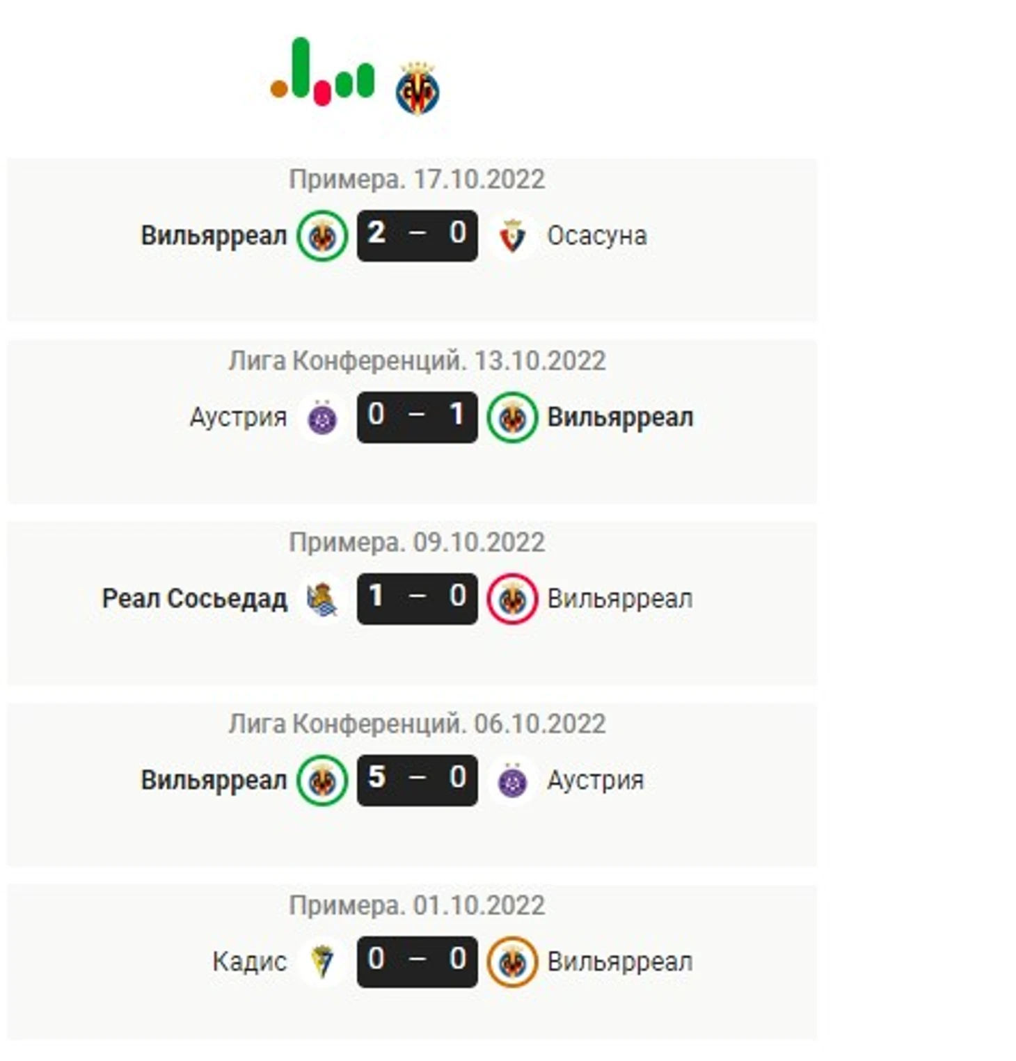 Предыдущие пять матчей (по состоянию на 18 октября 2022 года) команда Вильярреал провел следующим образом: