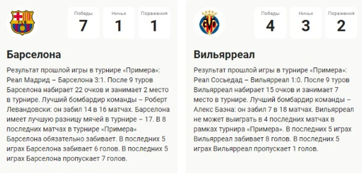 В 10 туре испанской Ла Лиги каталонская Барселона на своем поле сыграет с Вильярреалом. Игра состоится 20 октября 2022 года и начнется в 22:00 по московскому времени.