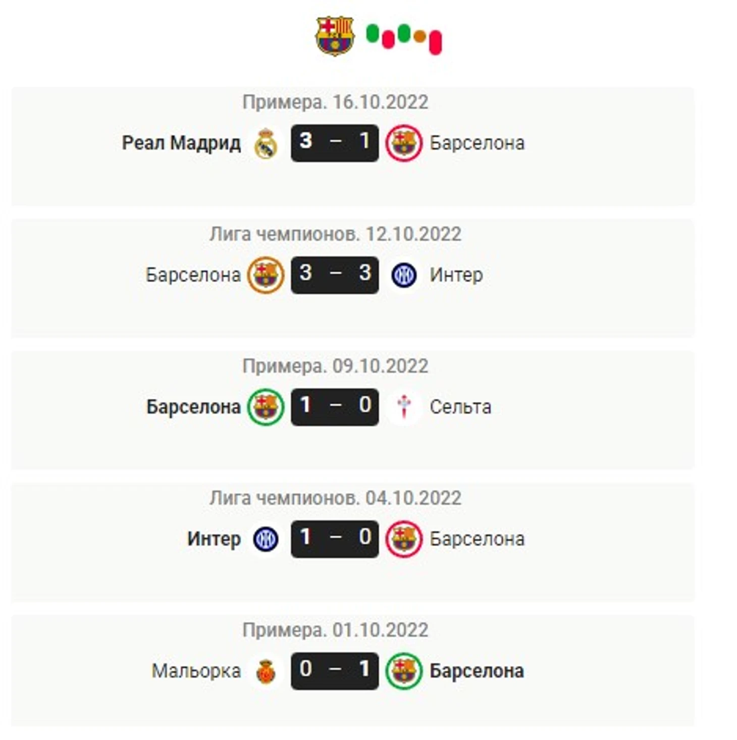 Предыдущие пять матчей (по состоянию на 18 октября 2022 года), каталонцы провели следующим образом: