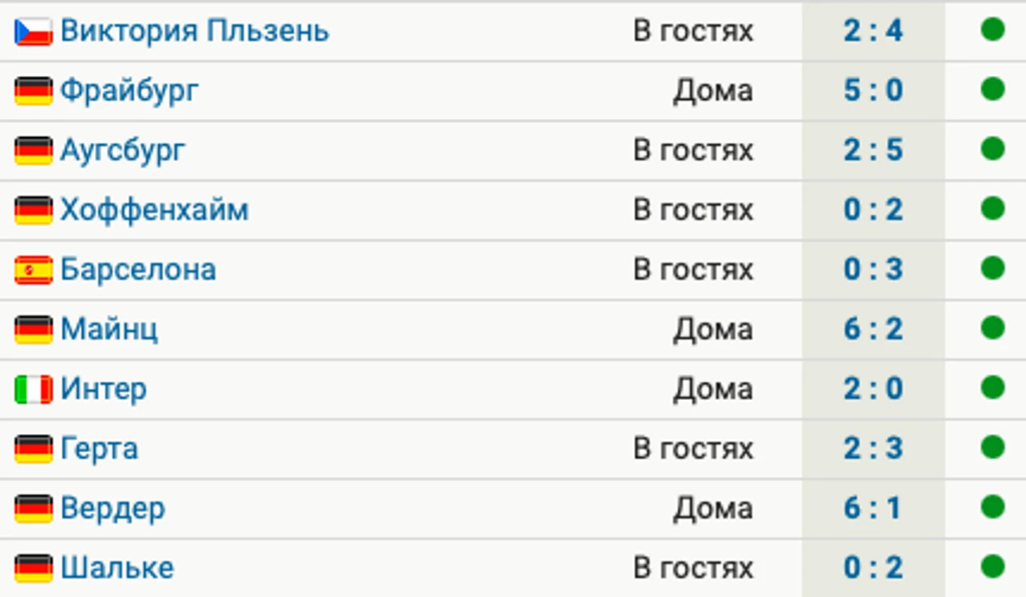 До этого были победы над «Вердером», «Гертой», «Интером», «Майнцем», «Барсой», «Хоффенхаймом», «Аугсбургом», «Фрайбургом» и «Викторией».