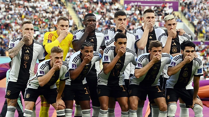 Вчера, перед игрой с Японией, футболисты закрыли рты руками на общекомандном фото. Игроки сделали это в знак протеста против запрета со стороны ФИФА на ношение капитанских повязок OneLove.