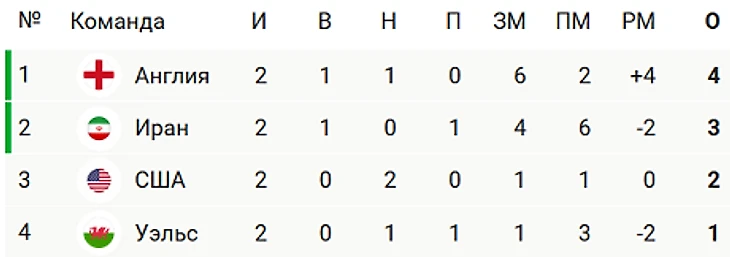 Англия лидирует в группе B после 2 туров ЧМ-2022.
