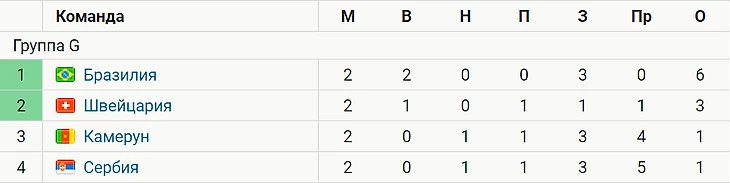 Бразилия лидирует в группе G с 6 очками, Швейцария – вторая с 3 баллами, у Камеруна и Сербии по 1