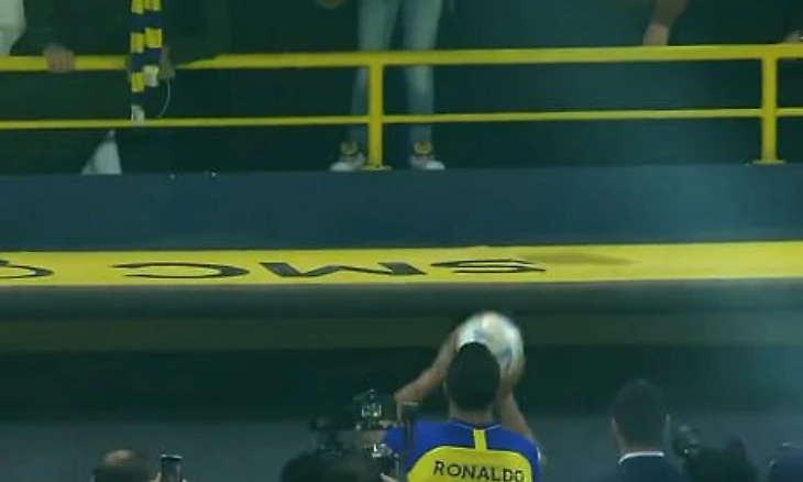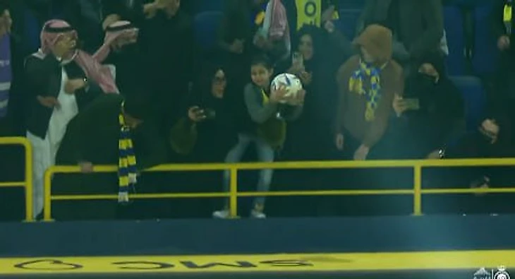Роналду подписал несколько мячей и выбил на трибуны во время презентации в «Аль-Насре». Один из них игрок бросил девочке-зрительнице