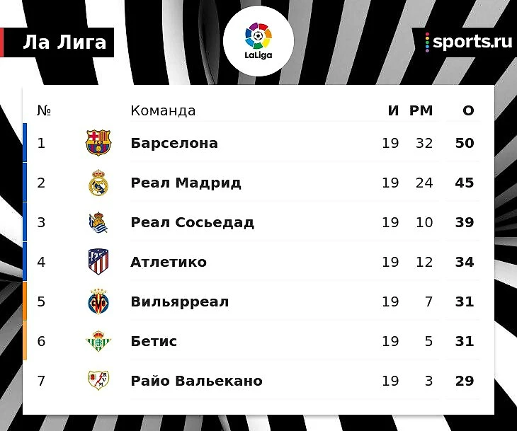 На третьей строчке расположился «Реал Сосьедад» с 39 очками, далее «Атлетико» с 34.