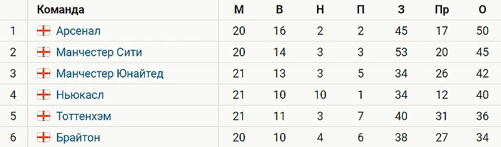 Первые два места занимают «Арсенал» (50) и «Манчестер Сити» (45) – они провели по 20 матчей.