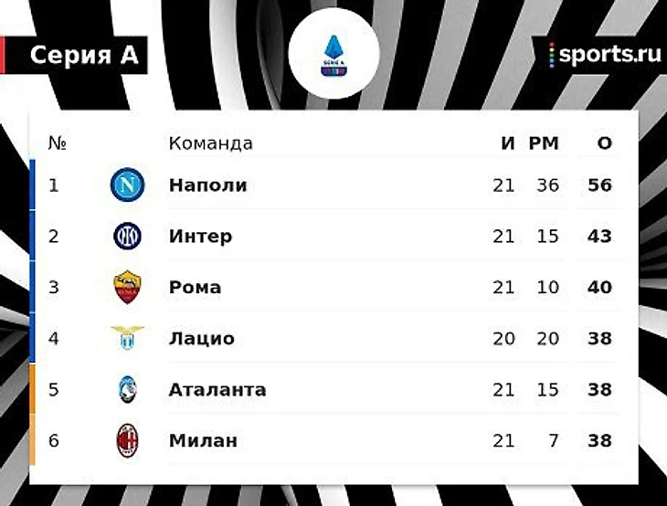 «Интер», идущий вторым, отстает от лидера на 13 очков, занимающая 3-ю строчку «Рома» – на 16 очков. «Лацио» и «Аталанта» имеют равное с «Миланом» количество очков, однако римляне сыграли на один матч меньше, а «Аталанта» опережает «россонери» по разнице мячей.