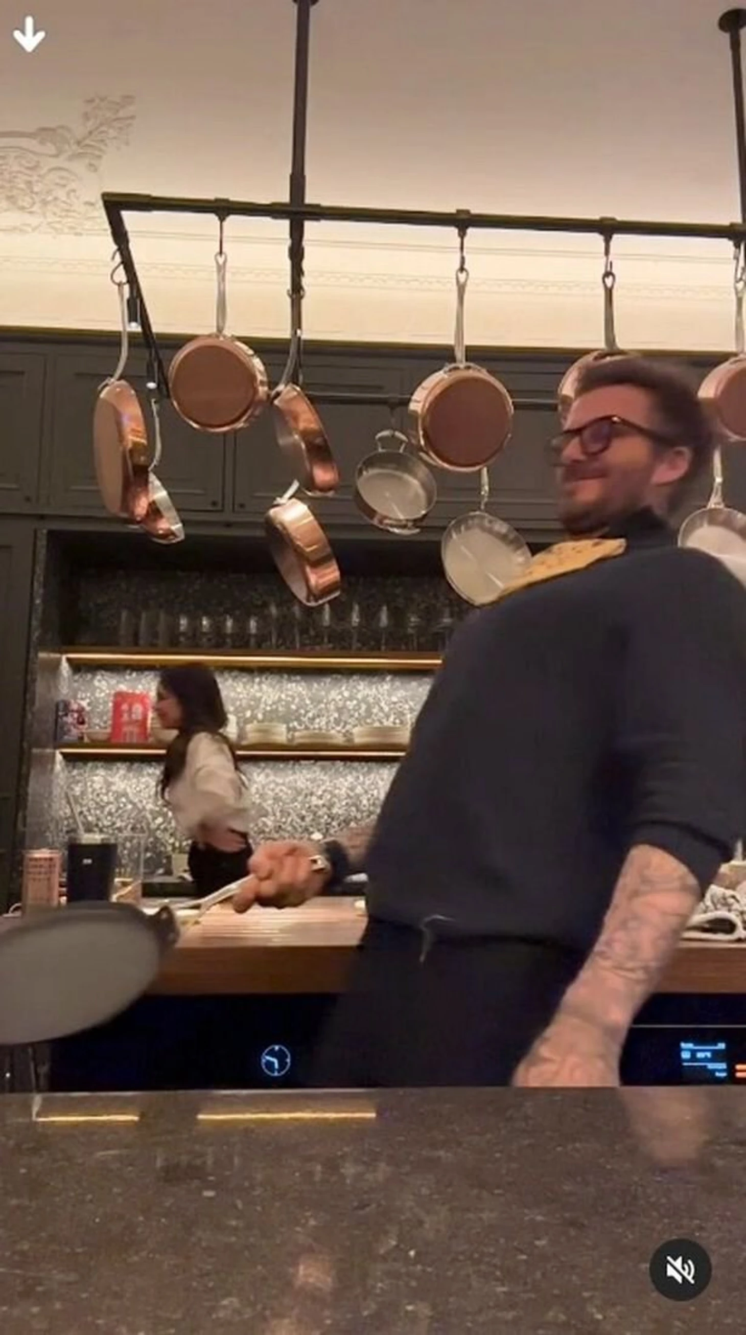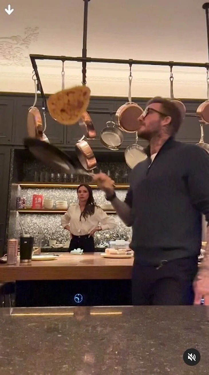 Во вторник бывший игрок сборной Англии опубликовал в инстаграме видео, на котором он подбрасывает блинчик на сковородке, переворачивая его, пока его супруга Виктория наблюдает за ним. Экс-футболист поймал один из блинов на грудь.