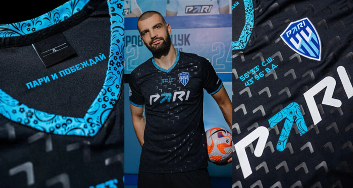 Дизайн вдохновлен главной достопримечательностью города – стрелкой, разделяющей Волгу и Оку. Там расположен стадион команды, а его координаты отпечатали на груди у футболистов.