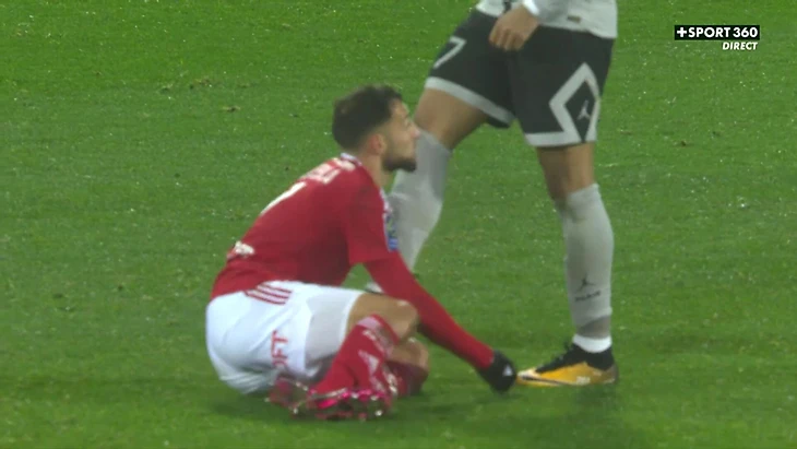 Мбаппе пнул хавбека «Бреста», схватившего его за ногу двумя руками. Оба получили по желтой