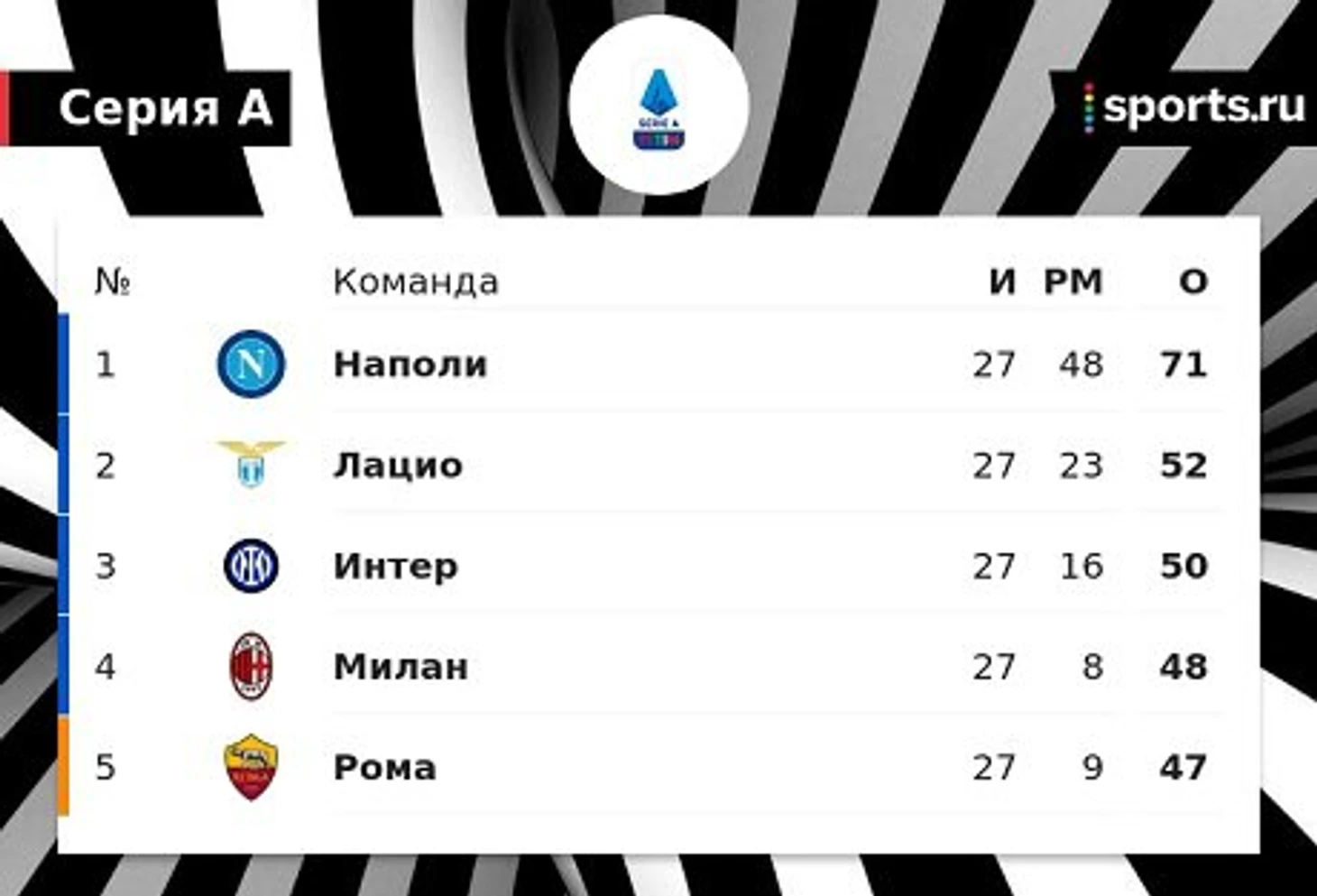 Отрыв «Наполи» в Серии А вырос до 19 очков. «Лацио» поднялся на 2-ю строчку, обойдя «Интер»
