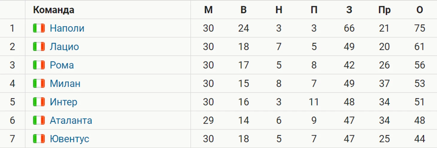 Выше «Ромы» идут только «Лацио» (61) и «Наполи» (75).
