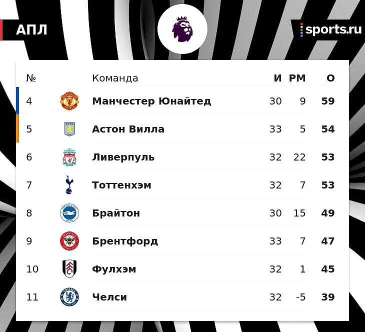 На данный момент «синие» идут на 11-м месте с 39 очками за 32 игры. Занимающий 4-ю строчку «Манчестер Юнайтед» набрал 59 баллов за 30 матчей.