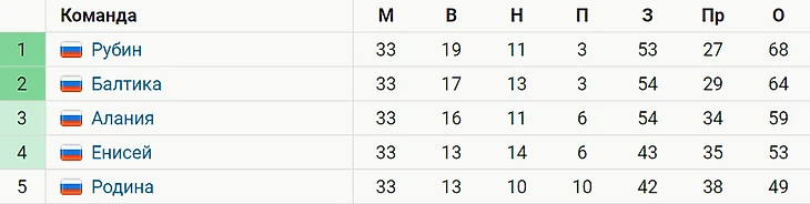 После 33 туров у казанцев 68 очков. Они опережают «Балтику», вчера потерпевшую поражение от «Алании» (1:3), на 4 балла.