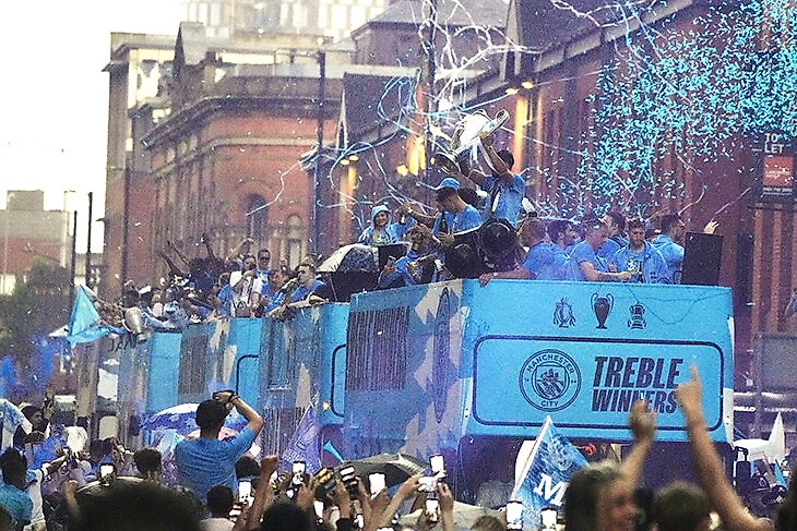 Автобус с игроками и тренерами «Сити» проехал по улицам Манчестера, фанаты поприветствовали команду.
