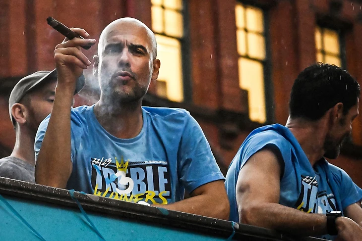Главный тренер «горожан» Пеп Гвардиола во время парада закурил сигару.