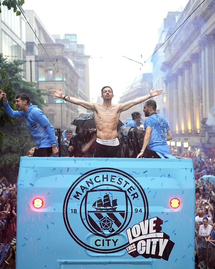 Полузащитник «Сити» Джек Грилиш выложил фото с мероприятия. На изображении футболист стоит на крыше клубного автобуса без футболки, раскинув руки в стороны.