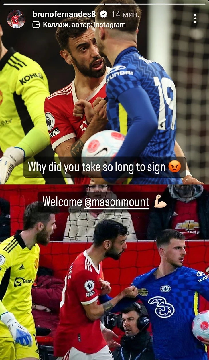 В инстаграме Бруну выложил коллаж из фотографий, на которых он держит Маунта за футболку во время матча «МЮ» против «Челси».