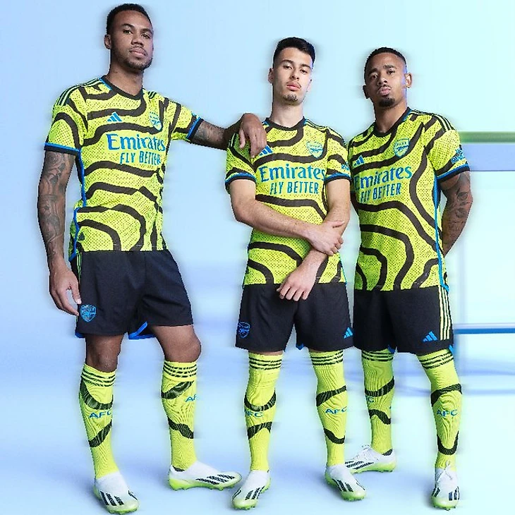 Лондонский клуб представил комплект, разработанный компанией adidas. В сезоне-2023/24 футболисты «Арсенала» будут проводить выездные матчи в желтых футболках с черными полосами и точками. Логотипы клуба и его спонсоров выполнены в голубом цвете.