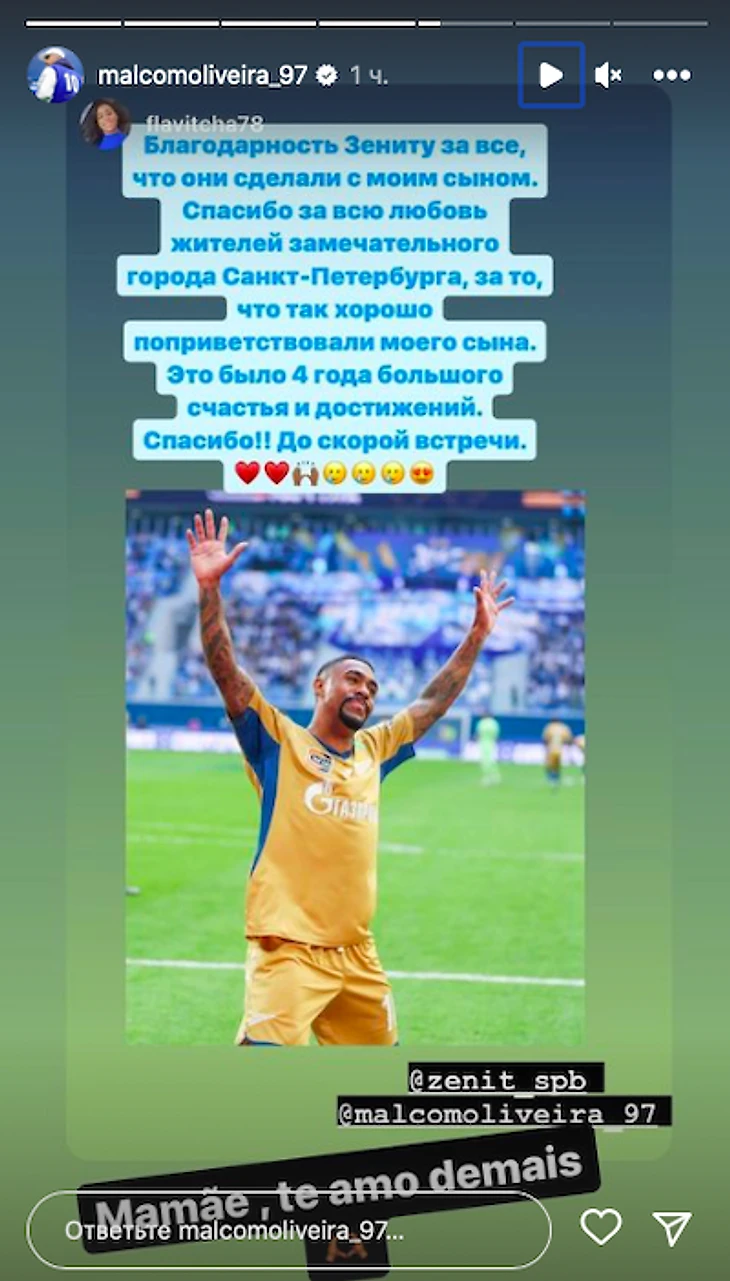 Мама Малкома на русском поблагодарила «Зенит»: «Это были 4 года большого счастья и достижений. До скорой встречи»