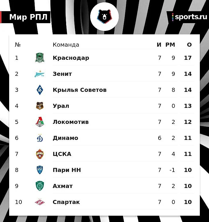 На данный момент у «Краснодара» 17 баллов. «Зенит» и «Крылья Советов» набрали по 14 очков, догнать их имеет возможность «Динамо» (11 очков). Также в пятерку входят «Урал» (13) и «Локомотив» (12).
