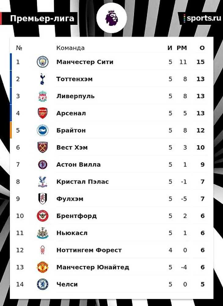 «Челси», сыгравший в 5-м туре вничью с «Борнмутом» (0:0), идет на 14-й строчке с 5 набранными очками.