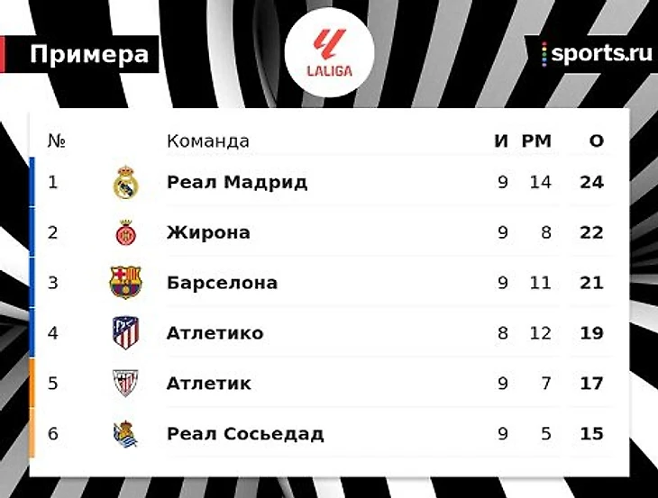 После субботней победы над «Осасуной (4:0) «Реал» идет на 1-й строчке с 24 очками. Второе место с 22 очками занимает «Жирона».