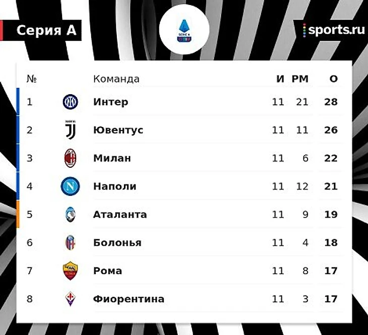 «Интер» лидирует в таблице, набрав 28 очков. «Ювентус» идет вторым, имея 26 баллов.