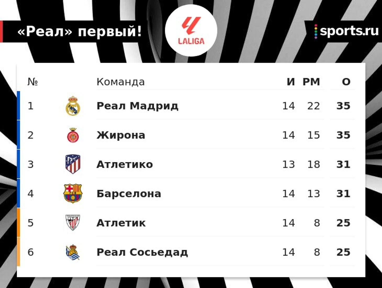 «Реал» вышел на 1-е место в Ла Лиге, опередив «Жирону» по дополнительным показателям. «Атлетико» и «Барса» отстают на 4 очка, у мадридцев игра в запасе