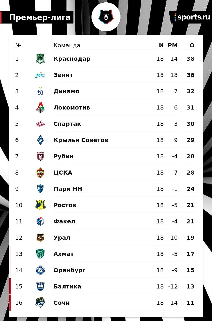 «Краснодар» впервые стал зимним чемпионом РПЛ. «Зенит» отстает на 2 очка. «Динамо» – 3-е, «Спартак» – 5-й, ЦСКА – 8-й