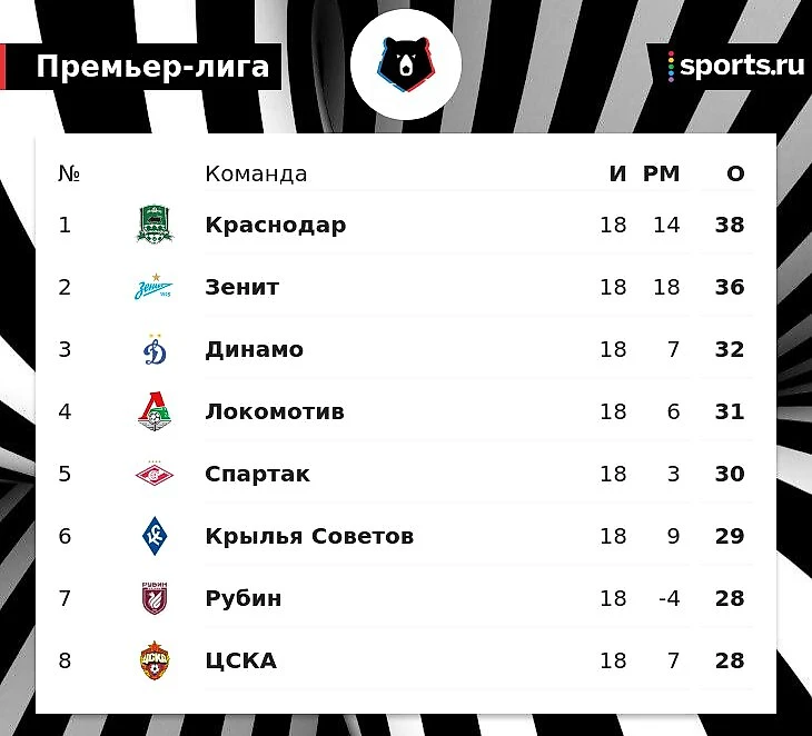После 18 туров в Мир РПЛ лидирует «Краснодар», «Зенит» идет 2-м, отставая на 2 балла.