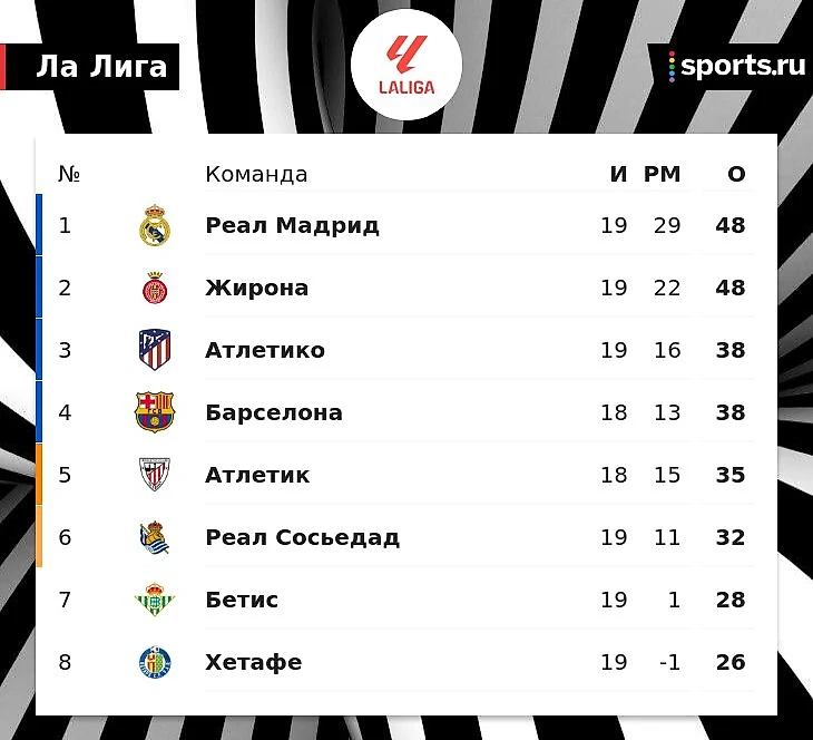 «Реал» и «Жирона» набрали по 48 очков после 19 туров. Мадридцы расположились выше благодаря дополнительным показателям.
