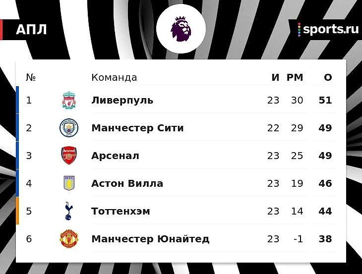 «Ман Сити» отстает от «Ливерпуля» на 2 очка при матче в запасе после 23 туров АПЛ